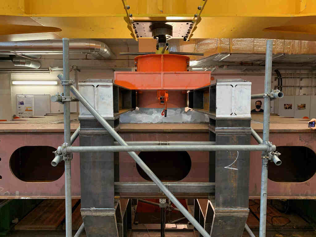 Ice loads pose a significant hazard to ship and offshore structures. Unlike in automotive industry, for example, full-scale collision tests of ships are hardly possible. In order to be able to investigat critical ice-induced deformations of real ship structures in a laboratory envirement the ice extrusion test was developed at the Instiute of Ship Structural Design and Analysis at Hamburg University of Technology. During the experiment, an ice specimen is pushed out of a confining pipe (orange) against the considered test structure. In previous campaigns, both quasi-rigid and ice-strengthed panels, such as those commonly used for ships in the Baltic Sea, were investigated. Plastic deformations of the panel up to 87 mm were achieved at 4 mm/sec cylinder velocity. The experimental data are now available to improve the understanding of ice-structure interaction and for the development of new or the enhancement of existing numerical models to enabable reliable simulatins of ice loads for e.g. risks accessment, operational guidance or rule development.– Hauke Herrnring